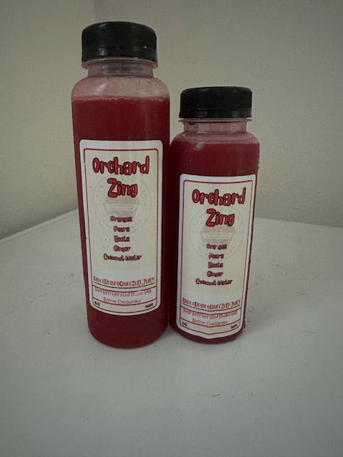 Cold Pressed Juice contains oranges, pears, beets, ginger, coconut water. Bring a little sparkle to your day with Orchard Bling!
